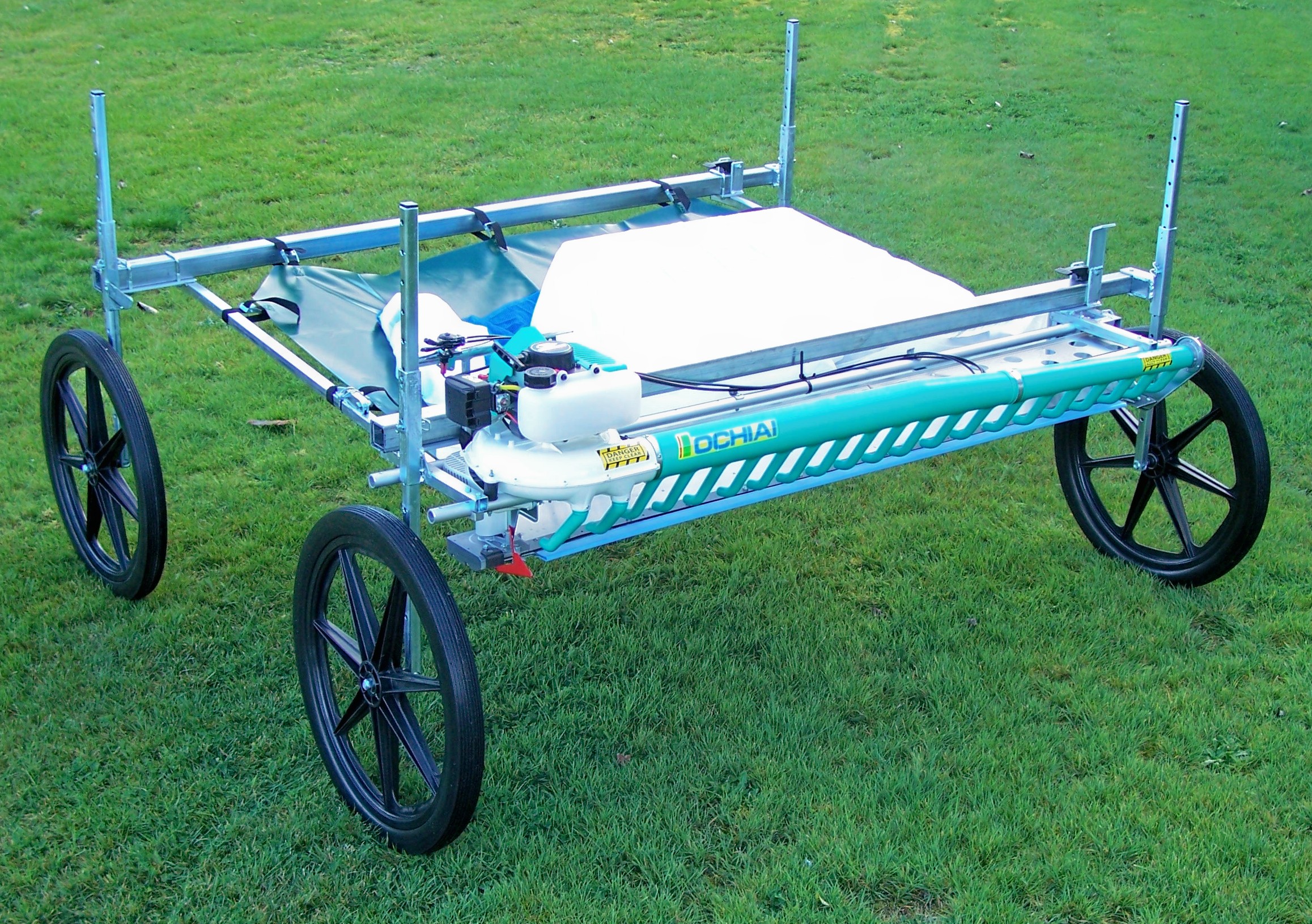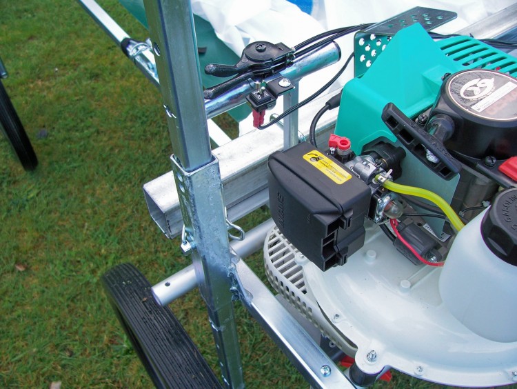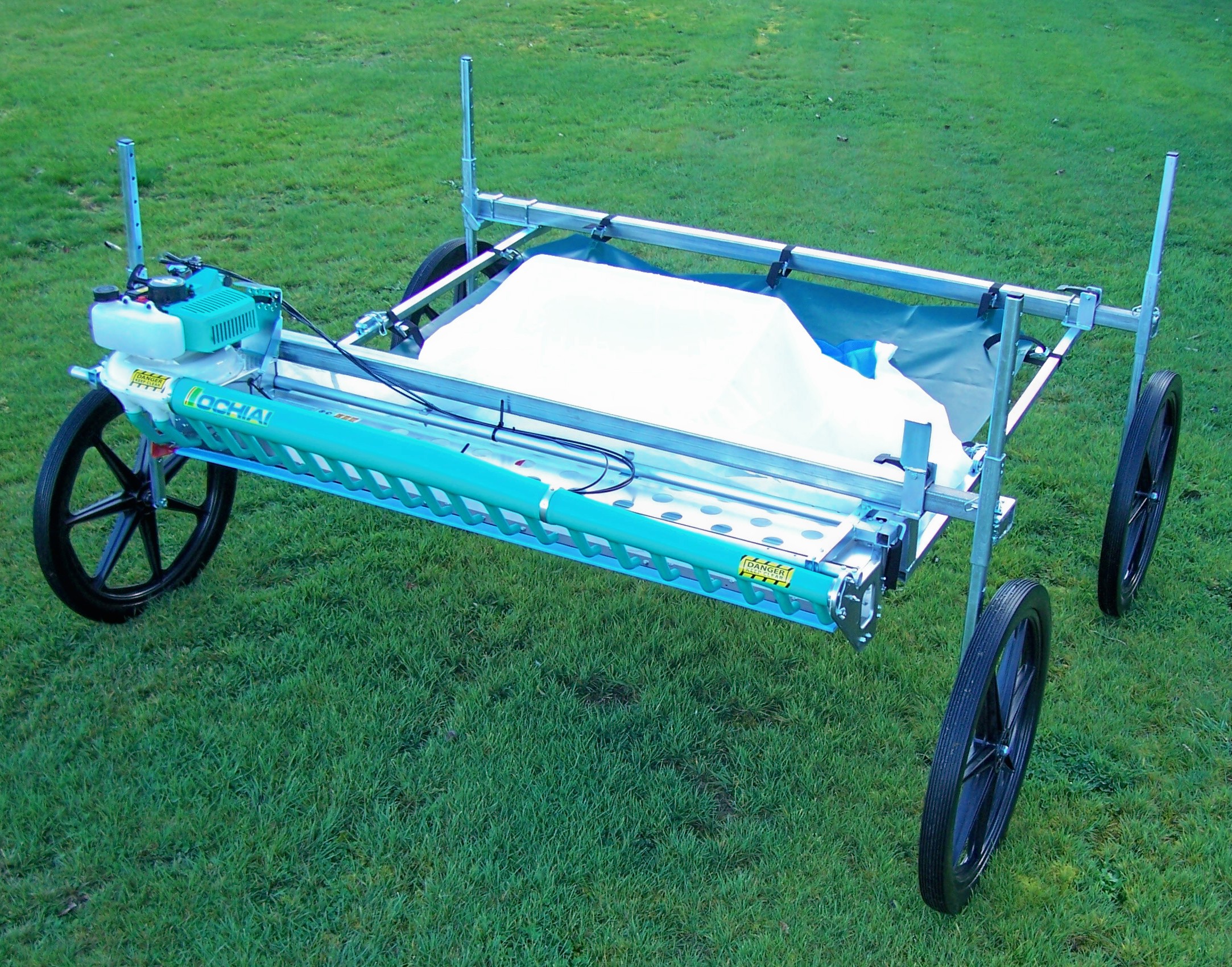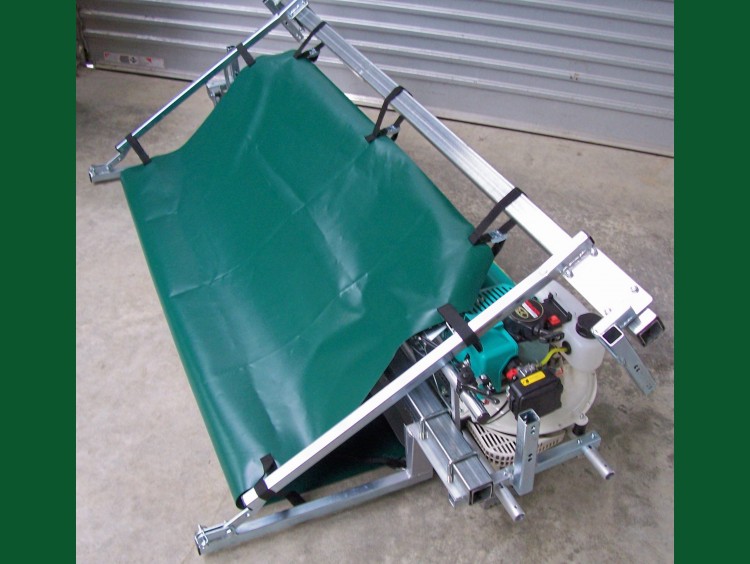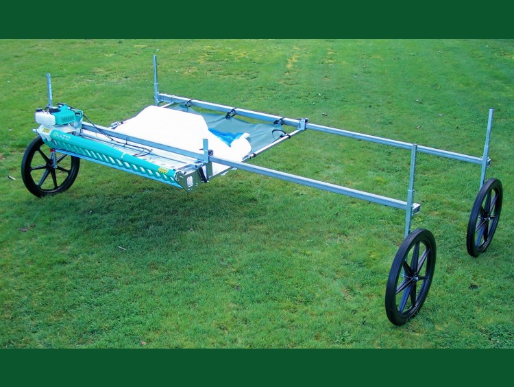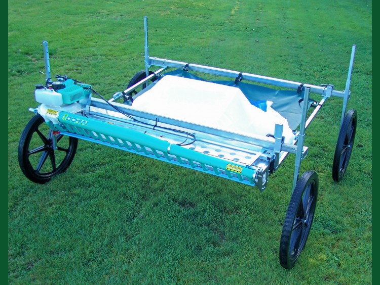 The power head is adjusted to the cutting height required. The operator pushes the harvester forward and the power head cuts and blows the cuttings into a collection bag. The bag has a quick release frame fitted to it so when full, the frame can easily be lifted off the harvester and emptied into a bin, trailer or other bulk storage.