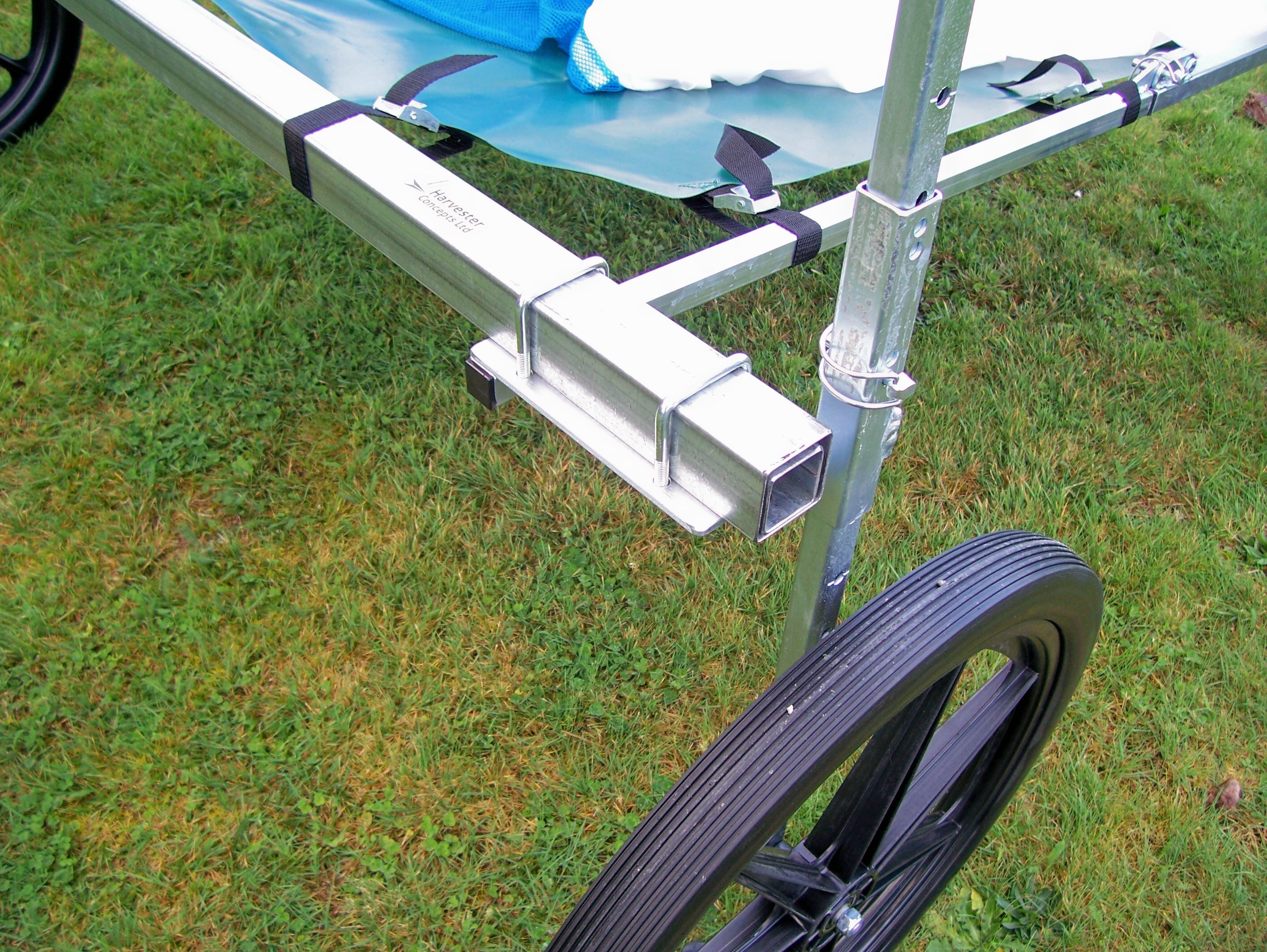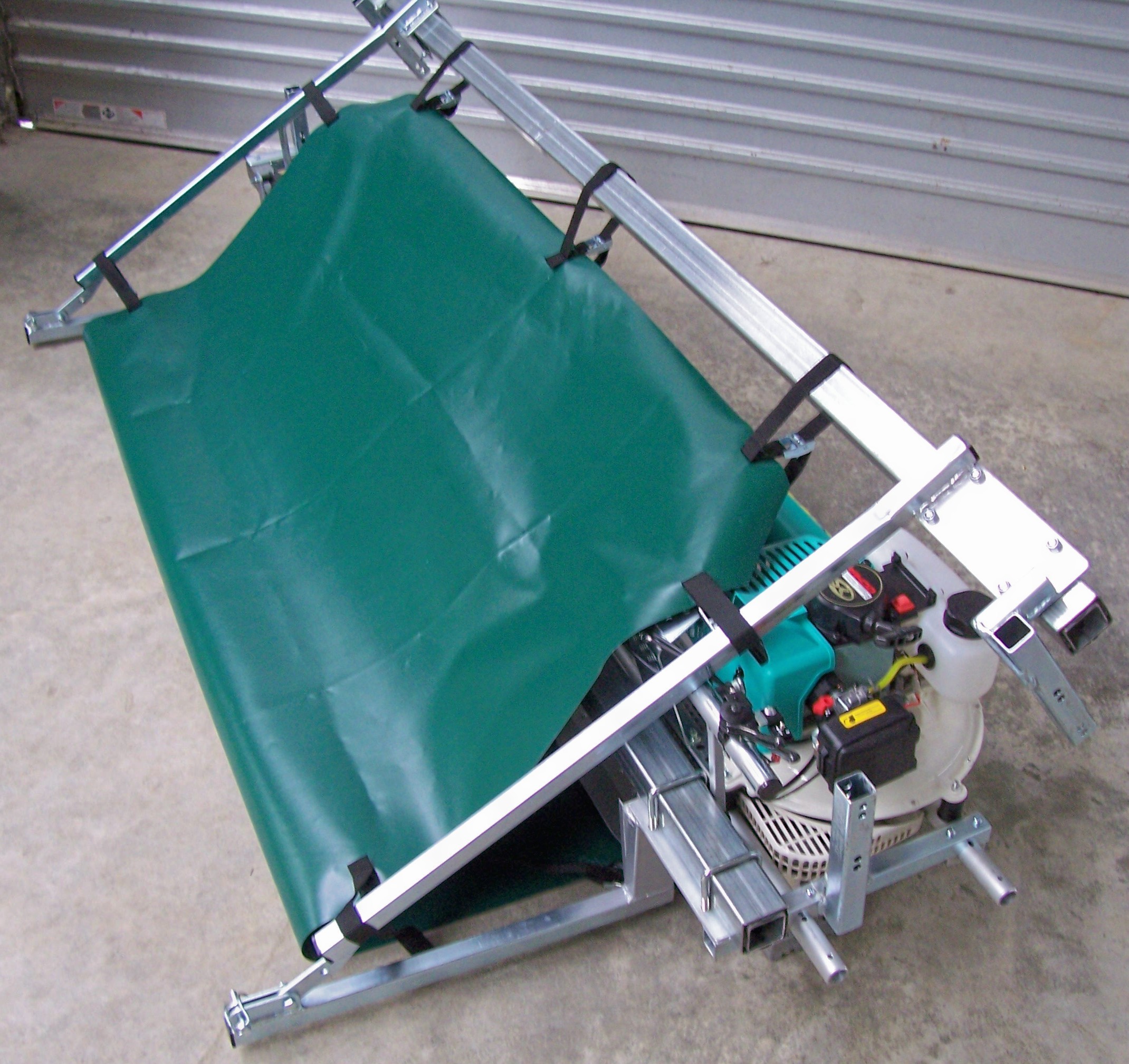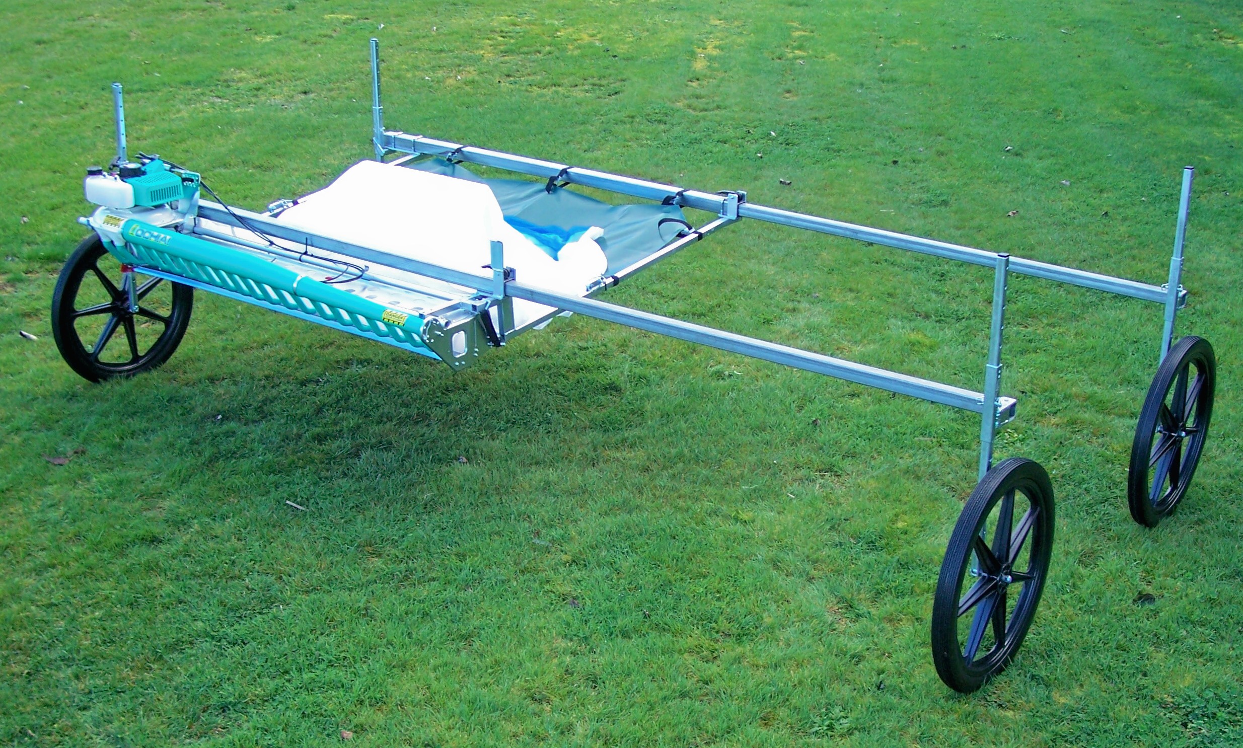 The power head is adjusted to the cutting height required. The operator pushes the harvester forward and the power head cuts and blows the cuttings into a collection bag. The bag has a quick release frame fitted to it so when full, the frame can easily be lifted off the harvester and emptied into a bin, trailer or other bulk storage.